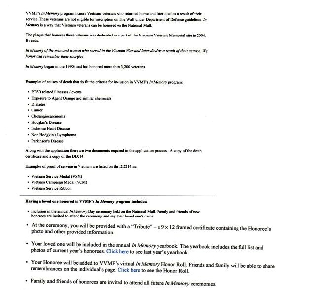 READ THE FOLLOWING INFORMATION ON THE IN MEMORY PROGRAM  To Apply Download and Fill out Form FAQ on Form For addional information visit site www.vvmf.org/InmemoryProgram |